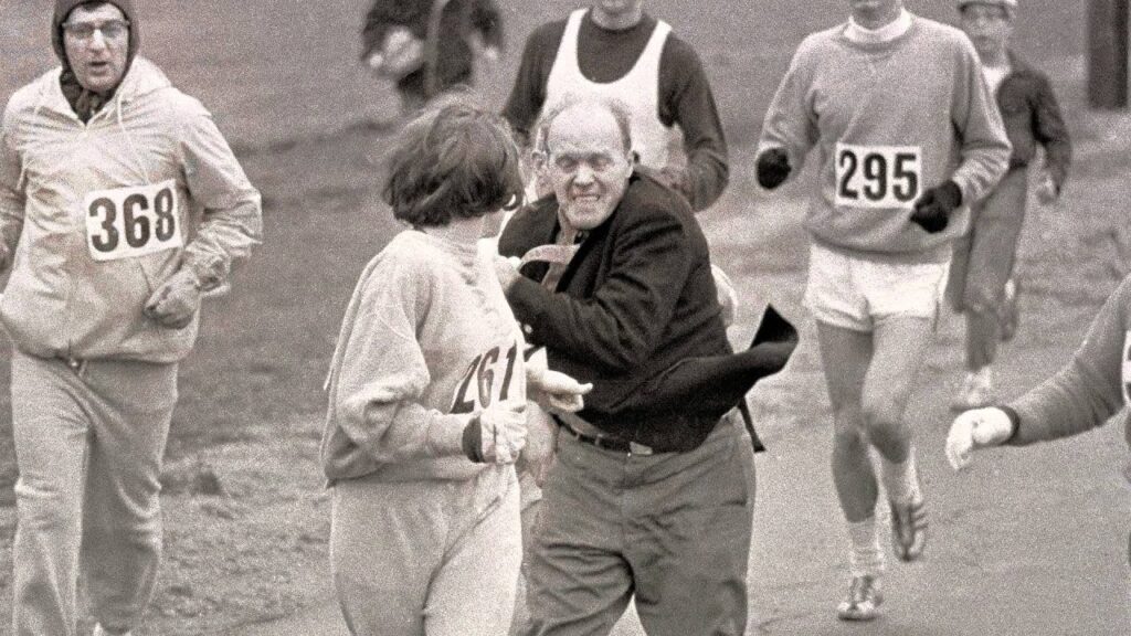 Το 1967, η Katherine Switzer έγινε η πρώτη γυναίκα που έτρεξε στον μαραθώνιο της Βοστώνης. Ο διοργανωτής μόλις κατάλαβε ότι μια γυναίκα τρέχει στον μαραθώνιο την κυνήγησε για να την σταματήσει. Αλλά ο σύντροφός της και άλλοι αγωνιζόμενοι μπήκαν μπροστά ως ασπίδα και την προστάτεψαν καθ’ όλη τη διάρκεια του αγώνα.